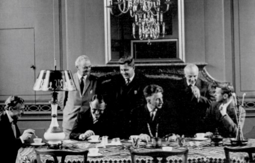 De raadzaal in gebruik bij een bezoek van de Provincie bestuurders. Staande links herkennen we wethouder G. Tulp en naast hem wethouder P. Schilder. Zittend 2e van links zit commisaris Belaarts van Blokland en daarnaast Burgemeester D. Breebaart.