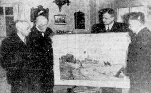 Van links naar rechts: de heer Wegdam, rustend hoofd der school R.K. school te Hoogwoud, dr. Pool (met de handen aan het schilderij), Ds. Kreb, pred. Ned. Herv. Gem. (achter het doek). de heer Hoogeboom (geheel rechts). voorzitter van de huldigingscomité, die het geschenk overhandigde. Foto Kuiper