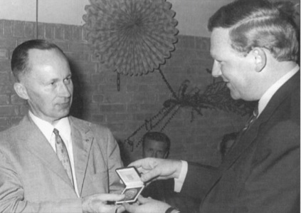Burgemeester W. Maat overhandigt dokter J. Pool de zilveren legpenning van de gemeente Hoogwoud.