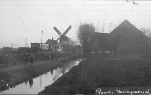 Rechts op de foto het station Hoogwoud. Links korenmolen 'De Lastdrager'.