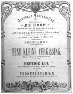 De uitvoeringen waren meestal op 1 e Kerstdag en de dinsdag daarna, wat de avond was voor de ouderen van het dorp. Er werd gespeeld in beide cafés, De Stompetoren toen van J. de Geus en De Roode Leeuw van C. Stapel. Om geld binnen te krijgen van kunstlievende leden had men een bode. Een bode word voor zijn diensten betaald fl. 1,50 per jaar. Hij was tevens de man die de anderen van het dorp op de hoogte hield van het wel en wee van de Kamer. Om geld bij elkaar te sprokkelen trad men vaak elders op, bijvoorbeeld in Noord-Scharwoude, maar voor hoeveel heb ik niet kunnen vinden. Ook verhuurde men de kamer (het decor) wel eens voor fl. 2,- aan verenigingen van het eigen dorp en voor fl. 4,- aan verenigingen van buiten, bijvoorbeeld het voorscherm aan 0. Schermer te Hoogwoud voor de somma van fl. 0,50. Entree was toen 40 cent en 30 cent en aanvang 19.00 precies. Het 12 ½ jarig jubileum werd gevierd op 12 en 15 maart 1896. Opgevoerd werd Toneelstudiën en Den Westfriesche visser; tevens waren er enige zangnummers en voordrachten. Entree 50 cent, minvermogenden halfgeld en onvermogenden vrijen toegang. De heer Groen is die avond blijkbaar goed in het zonnetje gezet, want voor de volgende bijeenkomst had hij een lied gemaakt `bestaande uit twee versjes en wenschte dat dit door elk lid werd aangenomen als bewijs zijner dankbaarheid'.