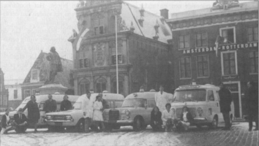 Ambulancedienst SOW van start, 7 februari 1972. V.l.n.r. de ambulance van Hoorn (taxi Kramer), Medemblik (fam. Boekel), Enkhuizen en Hoogwoud samen met een afvaardiging van hun bemanning en enkele vertegenwoordigers van het SOW.