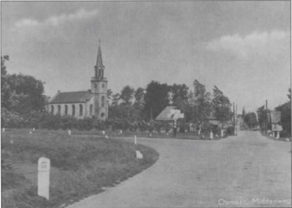 Begin jaren '50 kijkend vanuit Opmeer in de richting van Hoogwoud. De kruising van de Breestraat / Middelweg met de AC de Graafweg. Eén van de twee kruisingen die aanleiding gaf tot het ontstaan van de Ongevallendienst Hoogwoud.