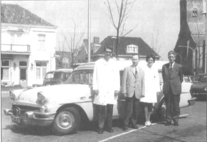 De Buick terug op Texel. V.l.n.r. Frans May, dokter Joh. Pool, Tiny Kaijer en oud-burgemeester Dirk Breebaart.