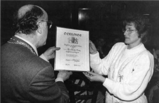 Burgemeester W.S.P.P. de Leeuw reikt de oorkonde van de gemeente Opmeer uit aan Afra Mooij-Dam.