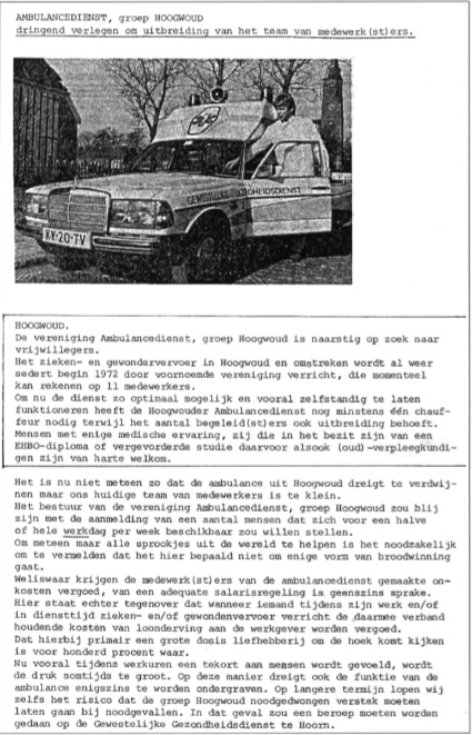 In september 1997 zal de ambulancedienst Hoogwoud ophouden te bestaan. Onder druk van de verder gaande professionalisering is het voor deze, door vrijwilligers gedragen, vereniging onmogelijk om nog langer zorg te dragen voor een afdoende invulling van de diensten. Het ontstaan van de vereniging, de aanleiding tot de oprichting en de reden van de opheffing zullen in dit artikel aan bod komen.