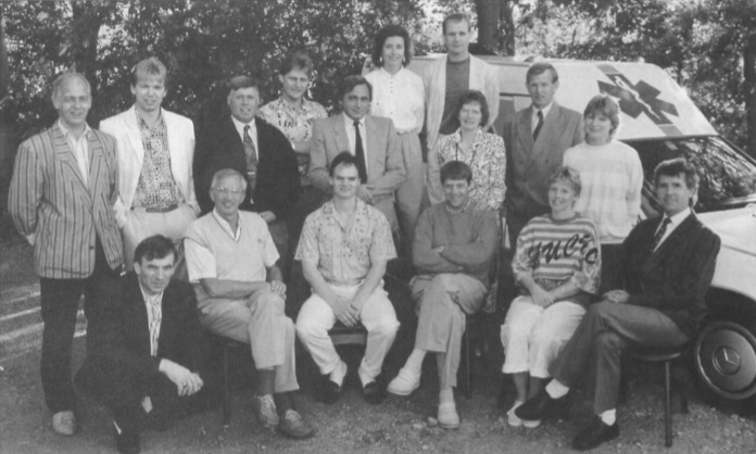 Foto gemaakt op 20 mei 1990 i.v.m. het 20-jarig bestaan van de Ambulancedienst Hoogwoud. Achterste rij: Wim Wehmeijer, Erik Mooij, Gerrit Dijkstra, Arjen Zwaan, Aad de Jong, Ingrid Besseling, Paul Kuijpers, Afra Mooij-Dam, Herman Siepe en Annet Mooij. Voorste rij: Kees Mooij, Henk Scheer, Marcel Mes, Theo Laan, Jeanet Koomen-van Baar en Kees Blankendaal.