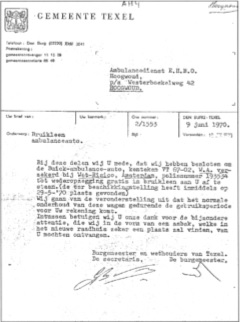 `Nou dokter, die datum kunnen we in onze agenda doorhalen', zei de heer Breebaart. Door bemiddeling van de heer Th. J. Vriend was men te weten gekomen, dat er op Texel een ambulance overcompleet stond. Onderhandelingen met de heer Van Doorn, directeur van Gemeentewerken aldaar, leidden ertoe dat B. en W. van Den Burg toestemming verleenden om de wagen gratis in bruikleen aan Hoogwoud af te staan. De wagen was op 29 mei 1970 reeds overgedragen en in een brief gedateerd op 9 juni 1970 werd formeel toestemming verleend.