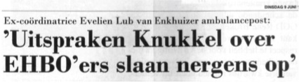 Op het hoogtepunt van het gekrakeel krijgen de vrijwilligers van Hoogwoud steun van ex-coördinatrice Evelien Lub van de Enkhuizer ambulancepost. Zij coördineerde vijf jaar lang de inzet van chauffeurs en bezetting van de Enkhuizer ambulancepost totdat die in 1991 werd opgeheven. Nadat ze zich lange tijd heeft kunnen inhouden laat zij op 9 juni 1992 optekenen 'Uitspraken Knukkel over EHBO'ers slaan nergens op' Zij geeft aan: 'Op de Enkhuizer ambulance zaten louter verpleegkundigen. In Hoogwoud bestaat de bezetting ook uit gekwalificeerde verpleegkundigen. Op één EHBO'er na. Ga maar na, alle Enkhuizer vrijwilligers zijn nu in dienst van het SOW. Op een enkele na rijden ook de chauffeurs weer op de ambulance.' Dit geeft eens te meer aan dat het, in tegenstelling tot wat Brokerhof en Knukkel beweerden, met de kwaliteit en het opleidingsniveau van het vrijwillige ambulancepersoneel wel goed zat en zit. Ook tijdens de opheffing van de ambulancedienst Hoogwoud zijn weer een groot aantal mensen overgegaan in een dienstverband bij het SOW!!