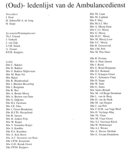 Toen echter de rondvraag kwam en een ieder zich kon opgeven om daadwerkelijk mee te draaien in de groep was het bedroevend om te zien hoeveel leden het aandurfden. Er waren misschien maar 5 aanmeldingen buiten de dames Kaijer. Mien en Tiny Kaijer hadden bewust een afwachtende houding aangenomen na kritiek op hun functioneren in de Ongevallendienst. Hen werd verweten steeds als eerste bij een ongeval aanwezig te zijn waardoor andere leden geen kans kregen om hun vaardigheden in de praktijk te tonen.