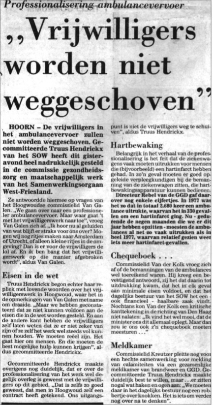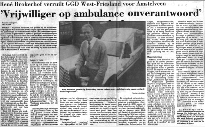 In een krantenartikel op 15 april 1992 laat de scheidende adjunct-directeur van de GGD René Brokerhof zich van zijn ware kant zien. Hoewel hij eerst zegt groot respect te hebben voor de vrijwilligers die de ziekenauto tegen een uurvergoeding van drie kwartjes runnen geeft hij verderop in het artikel aan diezelfde vrijwilligers te vergelijken met slagers. 'Ik vind het terecht dat de overheid de nadruk legt op kwaliteit in plaats van snelheid. Ik word liever pas na zeventien minuten geholpen door een deskundige dan binnen vijf minuten door een slager.'