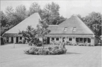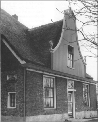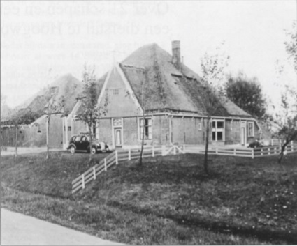 De voorgevel van de boerderij in 1947. Op deze foto is nog goed de pannenspiegel te zien op de westkant van de kleine stolp.