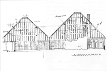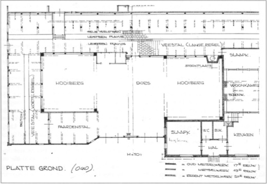Plattegrond van de boerderij zoals die was voor de grote verbouwing naar 3 wooneenheden.