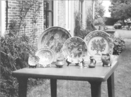 Enkele voorwerpen van het op het erf van de boerderij gevonden aardewerk (1580-1620). De drie linkse borden zijn van het zogenaamde slibaardewerk. Het grootste bord (diam. 37 cm) is van +/- 1590 en heeft een bloem in het midden met aan weerszijde een vogel. Het kleinere bord is gedateerd 1617 en er staat een leeuwtje in het midden. De twee borden aan de rechterzijde zijn Majolica aardewerk (1600-1620). De potjes zijn gebruiksvoorwerpen uit +/- 1600, o.a. een zalfpotje en oliekruikje.