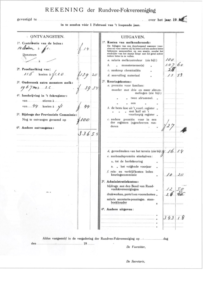 Nu werd secretaris Zeilemaker opgedragen de benodigdheden voor het uitoefenen van de werkzaamheden bij de Bond van Fokverenigingen te bestellen. Maar als men wat koopt moet men betalen. Om aan geld te komen werd voorgesteld om de oprichtingskosten per koe te berekenen en dat van de leden te innen als entreegeld. Ook boeren die later lid wilden worden moesten entreegeld betalen. De vereniging had nu direct bezittingen, de vergadering vond dat beter dan met schulden beginnen. De voorzitter sluit de vergadering en hoopt dat de nieuw opgerichte vereniging mag bloeien en tot voordeel van de leden mag zijn. Op 24 december 1913 werden de spullen door Veerman ontvangen, zodat men per 1 januari 1914 kon beginnen.