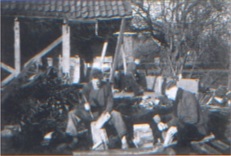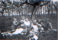 Juffrouw Alie Klaver onderricht de kinderen onder de fruitboom.
