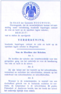 'De jeugd onderwijzen in het: leesen en schrijven en sijferen, mitsgaders de selve te oeffenen in de gronden van de waaren Christelijken Gerereformeerde Religi.' Zo werd het onderwijzen aan de kinderen van de Gemeente Hoogwoud in 1763 omschreven. Een aankondiging uit 1763: