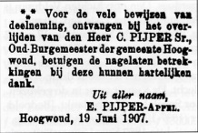 Jan: 7 jan: Maandag Dk Silver overleden alhier oud 33 jaar, ook dien dag de vrouw van C. van Twijver overl: oud 55 jaar. De bevolking te Hoogwoud bedraagt 1 jan: 1081 mannen en 1006 vrouwen, geslacht. Totaal 2087 perzonen. In Amerika zijn verongelukt door de sporen 3969 menschen gedood en 12514 gekwetst in het jaar 1906. 12 jan: 's morgens 7 uur Cn Pannekeet zijn huis verbrand. Men ziet thans vertooniging van vliegmachines, met een wagen daaraan hangende, om zoo een reis door de wereld te maken; ze praten van droom en malligheid der lucht omnibussen maar komen doen ze, en met een reeks van jaren zegt Santos Dumont [de Braziliaan Santos Dumont vliegt in 1901 met een zelfgebouwd 'slap' luchtschip om de Parijse Eiffeltoren], want vliegen probeeren wij al, en kunnen al van den grond opgaan (wij zullen zien). Van 21 jan: op 22 jan: de eerste dag eene fijne regen, en den volgenden morgen vroor het 19º vorst, nog een dag later 22º vorst uit een oosten. Zij rijden al schaatsen. 6 feb: Kaatje Wever getrouwd. Er wordt overal schaatsen gereden. Van 19 op 20 Feb: des 's nachts om 3 uur een geweldige storm uit n-west met onweer. Te Anna Paulowna zijn van T. Portegijs 3 koeie dood geslagen net om de andere was er een dood, op de stal. De nacht van 20 op 21 is de stoomboot Berlin van den Harwich lijn Rotterdam, op den Hoek van Holland vergaan, door op de pier te loopen. Deze is 's avonds van Rotterdam vertrokken, en is 's morgens half zes op de pier geloopen, zoo dat de Berlin aan tweeën is gebroken, er waren 91 passagiers en 60 man ecupatie [bedoeld is equipage = scheepsbemanning] aan boord één man gered, velen zijn er al verdronken, op het achter gedeelten van den boot, zijn nog levende menschen aanwezig, die wachten op redding als de zee wat bedaard. 15 menschen zijn nog gered (zegge 15). Prins Hendrik heeft zich erg verdienstelijk gemaakt, door mede in de boot te stappen, om den laasten te redden. De plaats van Cn Pauw te Benningbroek verkocht. Publiek aan Cn Wijdenes van Twisk ruim 19 h.a. voor f 47000. De producten van den koe boer zijn duur, kaas f 35. Van 15 op 16 maart vrijdag op zat: nacht. Cn Mantel van Schagen, zoon van P. Mantel alhier zich laten verdrinken, mogelijk door de ongesteldheid van zijn vrouw, die 3 weken later eerst weten mogt als dat haar man was overleden. Hij was 43 jaar. Woensdag 15 mei Cn Pijper oud burgemeester te Hoogwoud overleden, oud 77 jaar, slechts 4 dagen was hij ongesteld. 13 juni. Stemming voor den Prov:aale Staten, gekozen Buis r.k. Tenzen antrerov: Bos r.k. Dus dit gaat deze keer alles rechts. Wij hebben weer tongblaar onder ’t vee. Het is nu 20 juli. En wij hebben nog niet anders dan een koude N- of N.Oosten wind gehad, met een grauwe lucht, de zon komt niet zichtbaar (het is bijzonder erg), veel nachtvorsten. Zoo 13 juli Dk Koelemei overl: oud 47 jaar. Kastelein te Spanbroek. Aug: koud en droog, met geen druppel water. Sep: mooi weer, maar geen spatje water overal heerscht groot watergebrek. Wij hebben niet een enkel buitje gehad, den gehelen zomer, en geen zon gezien; geheel niet haast. Ja zoo erg was het, en toch is de zaadbouw goed (zelfs best) behalven boonen en erwten. Oct: het regent eindelijk. 6 oct: wij hebben water genoeg gehad, zonder onweer. De tongblaar heerscht alzoo maar voort, er komt licht op voor de blaar, (Een zekeren Van Baar uit Baarn gaat ze enten, veel geld verdient, maar spoedig slechte resultaten daar van. Juffrouw A. Rooker bedankt als schoolmatres alhier. Er zijn 10 sollicitanten gek: Jufr: ….. Laast oct. den ouden heer Wouthman ovl: oud 93 jaar (zoo). De herberg verk: van den wed: De Geus Aartswoud aan Keizer van Winkel voor f 6000. Oostwouder zijne herberg verk: aan eene Has voor ƒ 10.000 uit den hand. 18 nov. Alhier opgericht eene Copratieve Rafeizen Boerenleenbank, er traden 54 leden toe. Wat hebben wij eene mooie herfst gehad, het vee liep heel Lang buiten, de meeste tot in dec: en duur vee, handel troef. In oct. Heb ik mijne herberg laten veranderen met eene voormuur, gekost ƒ 960. De plaats van den weled: heer Donker te Bloemendaal: De plaats licht te Hoogwoud, en werd bewoond door P. Pannekeet, is uit den hand verkocht; aan P. Deken uit ’t Weeltje te Hoorn, groot 12 h.a. ruim met huis voor ƒ 25000. De plaats van Cn Pijper oud burgemeester alhier, liggende aan den Gouw groot 40-53-20 h.a.; verkocht voor ƒ 80147,65½ Cn Pijper junior heeft er 13-37-90 h.a. voor ƒ 2082,24. Perceel 19 en 20, groot 3-31 h.a. grasl. K. Slachter en Jb Tuinman voor ƒ 5161. 1 dec.: er is eene afteekening en den courant van Medemblik; van het droogmaken van het Wieringer Meer groot 19500 h.a. 3 dec: het perceel van den wed: Tm Leek alhier uit den hand verkocht, aan Eekers van Blokker voor de som van ƒ 3000 met inbegrip van het inventaris. 1 dec: straatverlichting in den Kerkelaan gekomen, door den bewoners van den Laan bijgedragen (allen). 25 nov: de plaats van den ‘erven Heuvel van Twisk,’ gelegen te Opmeer, voorheen Jn v Leeuwen verkocht, groot 17 h.a. ruim, voor ƒ 40.039 en een arbeiders woning voor ƒ 1935 gekocht door Cn Govers van Sijbecarspel. 24 dec: Joh Wagemaker vergunning gekregen. 27 dec: Oostwouder kastelein vertrokken, en Has er ingekomen. Het wintert een beetje, mooi weer, maar het rijden op schaats is niets, want het dooit af en toe weer.