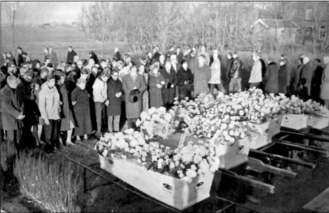 Het is een lange, hele lange stoet die zich naar het kerkhof in Aartswoud begeeft, gelegen achter de Nederlands Hervormde kerk. De zes kisten worden gedragen door de dragers van de begrafenisvereniging en door leden van de vrijwillige brandweer Hoogwoud-Aartswoud. Als eerste is daar vader Schaafsma met zijn kinderen en de moeder van mevr. Schaafsma-de Haas en hun verdere familieleden. In de stoet !open ook mee Dominee Oosterhoff en Pastoor Kellner, Burgemeester Breebaart met echtgenote, leden van de vrijwillige brandweer, de vele hulpverleners en de mensen uit Aartswoud, buren, kennissen en niet vergeten de mensen van de pers. Die wisten Aartswoud in die dagen heel goed te vinden en dat was niet altijd een genoegen.