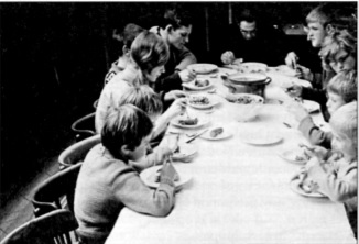 Het gezin Schaafsma aan tafel in hun tijdelijk onderkomen,