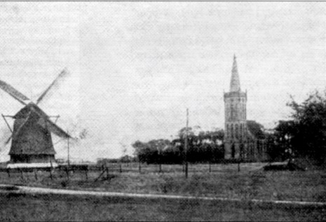 De Lastdrager en de kerk rond 1900. Vergelijk de ruimte tussen de molen