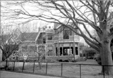 6. Een eenvoudig arbeidershuis (Burg. Hoogenboomlaan 17). Zoals in de inleiding al is verteld is dit een van de huizen die vanaf ongeveer 1900 op het weiland tussen de Spar en de voormalige bibliotheek werden gebouwd. De banden van gele (soms ook andere kleuren) stenen, de `rollagen' boven de ramen en het type dakpannen verraden de ouderdom van dit huisje. Het is in dezelfde periode gebouwd als de notariswoning, het eerste huis van de wandeling. Huizen als dit arbeidershuis hadden vaak nog bedsteden en een aparte wc aan de sloot, achter het huis. Pas na de tweede wereldoorlog kregen de mensen meer luxe artikelen zoals wij die nu kennen. Vóór die tijd moest men zich redden zonder dingen als een douche, een televisie, een auto, computerspelletjes, enz.