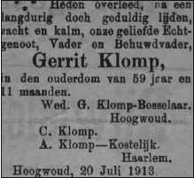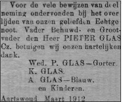 Vrijdag 17 maart is D. Langedijk van Barsingerhorn plotseling overl: Hij was dien dag 35 jaar oud. (men zegt van vergeving). 6 feb: is Jan Kunst smid voorheen te Hoogwoud overl: oud 80 jaar. Eene heldere mooie zonsverduistering hebben wij te zien gehad, op woensdag 17 april, het wier er koud en donker van, ik was net te Anna Paulowna. Een groote scheepsramp is gebeurd, het grootste schip ter wereld is vergaan met 1635 menschen aan boord, allen zijn verdronken {nvdr de naam van dit schip was Titanic}. Het liep op een ijsberg in zee. 20 april, er loopen al vele beesten in ‘t land met goed gras: erg voorlijk winter; 23 april, P. Mantel overl: oud 77 jaar van Hoogw. Delegentia te Alkmaar eindelijk in vlammen opgegaan, toch op ‘t toneel begonnen; (net als voorheen). An Rooker gehuwd met Antje Appel. Met de Pashen kermis Jn Wever met mes aan vechten geweest, is in arrest genomen tot de straf is uitgesproken; dit was 1/2 jaar en zoo gebleven. De laaste 2 Outo bandieten te Parijs zijn gesnapt, toch dood in handen gekomen. 15 mei, K. Mantel van Hoogwoud overl: oud 43 jaar (op woensdagnacht). De kwarwei is ƒ19,20 tarw 9,00. Het gewas in mei alles weelde. Zat: 8 juni geraken te Lutjewinkel 4 personen den een na den ander in eene ierkelder van Jn Nobel, door gebrek aan zuurstof, de oorzaak is bedwelmd door den stikstof, doch allen zijn gelukkig weer bijgekomen. Juni: alhier bestaat plan tot ‘t oprichten eener Copretieve Maalderij van graan, naam ‘Ons Belang’ te Hoogwoud. 13 juni, eene grasmaaier doodgevallen van den zolder van A. Donker, Pade te Hoogwoud. Wed: P. Mantel overl. te Winkel. K. Dekker zijn vrouw overl: Jn Hinke overl allen laast juni. 20 juli, de hooibouw is zoo gedaan, veel geteeld, het eerste is slecht, het laaste is best. Het [is] 3 weken droog. 22 juli, bijeenkomst te Hoogwoud over den Elextrische Centrale: de raad afwijzend beschikt. De bouwplaats bewoond van Geertsema te Anna Paulowna verk: groot 44 h.a. en heerenhuis voor ƒ105.000 ruim aan verschillende koopers. 13 jaar terug gold die plaats ƒ30.000. Er is veel nahooi geteeld, en best gewonnen. Het is eene rijke tijd. 2 aug: Friedig Fack van Amsterdam overl: 63 jaar oud, met de tijd van 8 dagen, dinsd: te markt, en dinsd. begraven. 5 aug: de raad van Hoogwoud cerculeerd aan den ingezetenen eene lijst: om te teekenen voor het Elextries licht: maar alzoo geen licht, den uitslag. 20 aug: Generaal Boot, de oprichter van het leger des Heils, te Londen overl: een wordt opvolger {Bedoeld is: Booth, William (1829-1912), Engels theoloog, stichter van het Leger des heils}. Veel onweer, en veel water, vanaf 20 juli, spek 33 cent, koevleesch 42 a 43. 21 aug 1912. Notaris de Boer van Hoogwoud eene Outo begonnen te rijden: Viat merk. 26 aug: 3 dagen groot feest in den Beemster van het 300 jarig bestaan van af den droogmaking der polder, 1612-1912. Woensdag 4 sep: groote landbouwtentoonstelling te Medemblik, veel opgeofferd, maar het is zulk slecht weder, alle dagen regen en wind, zoodat er weinig bezoek is geweest, en alles groot schade heeft ondervonden. Sep: Jb Kistemaker lid van den raad geworden van Barsingerhorn. En heeft de plaats gehuurd van A.D. Waiboer... Firma Laan te Wormerveer. Menister Dr Kuiper neemt zijn ontslag uit den 2de Kamer (wegens doofheid) of krijgt het te benauwd {Bedoeld is: Kuyper, Abraham (1837-1920), Nederlands theoloog, staatsman, publicist; stichtte 1880 Vrije Universiteit; vele malen lid Tweede Kamer; 1901-1905 minister-president. Leider der Anti-Revolutionaire Partij. Speelde een belangrijke rol in de schoolstrijd}. 16 sep: Domine Dijkema alhier gevestigd, Hwoud. P. Schilder zijn huis en land verkocht aan C. Dol uit den hand, mei te aanvaarden 1913, groot 4 h.a. vanaf 11 sep: tot 27 sep oosterwind met veel nachtvorsten duurt tot half oct: weinig gras en ‘t vee heel duur. Begin oct: Duitsland open voor vleesch invoer. 16 oct: gaan ze er levendig heen, er gaat veel vee heen, maar de prijzen zijn daar niet hooger als hier 42 cent. Turkeije en Italië hebben den vrede gesloten. Montenegro heeft den oorlog verklaart aan Turkeije en direct begonnen te vechten. Het heet den Balkan Oorlog. De plaats van de erven Pluister W. Waard in den Sluishoek publiek verk: 15-8-30 h.a. voor ƒ44.000 zoo. Het huis en erf van Jn Rood bewoond door A. Verwer verk: gekocht door Joh: Wagemaker voor ƒ16.00. 16 Honderd. De plaats van den erven P. Mantel verk: den 29ste oct: koopers huis en erf W. Vijn voor ƒ2105; Dr Pool 1-42-15 h.a. voor ƒ2780 per h.a.; O. Schermer 1-54-80 h.a. voor ƒ2085 per h.a.; P. Kuin het 400tje voor ƒ1215, tezamen alles ƒ10.715. Het vee is deze herfst heel duur, gelde 30 a 35 cent; kalve ƒ100 vaarse 180 a ƒ200; vette 42c, spek 30c, wol 21 st. D. Aartman het land gehuurd van C. Helder voor 131 per h.a. voor 4 jaar.