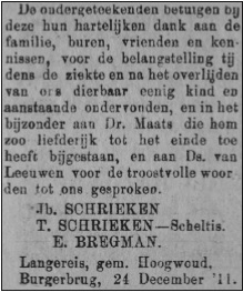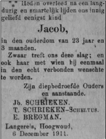 3 dec: maandag Jb Schrieken van Hoogwoud (Langereis) begraven is den 29ste nov. overl in den ouderdom van 23 jaar. 11 dec: het huis en erf verkocht van P. Schipper alhier, Boekelweg groot 1-72 h.a. voor ƒ4734, gekocht door E. Stapel waarvan P. Koenis 500 roeden heeft voor ƒ1600 ruim. Het is eene groene Kerstijd met af en toe een weinig water, geen vorst. De overhouders niet duur ƒ16 de 20. Er is land van Wm Schuurman te Bovencarspel verkocht, 3 h.a. met huis voor ƒ29000 kreeg 1 morgen land toe, dat niet te best was. Er worden boerenplaatsen verhuurd voor 10 jaar vast, voor koolbouw a ƒ250 per h.a., wat duur. P. Schilder Pade Opmeer huis en 4 h.a. land verkocht. De Kolk te Lambertschaag droog gemaakt, molens weg. De zondagen van R.K. weggenomen, wat verminderd. {Bedoeld zijn een aantal feestdagen op maandag tot en met zaterdag, die geenszins werden afgeschaft, maar die men niet meer verplicht als zondag moest beschouwen, waarop men niet mocht werken.}