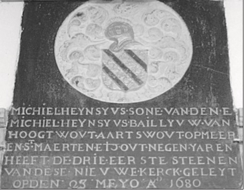 We schrijven het jaar 1680. Kleine Michiel is een flinke jongen van 9 jaar geworden. Hij zit op school bij meester Willem. Vandaag, 23 mei, is een spannende dag voor Michiel. Hij mag als zoon van de officier de eerste drie stenen van de nieuw te bouwen kerk leggen. Later zal er zelfs nog een gedenksteen met zijn naam worden geplaatst in de kerk boven de ingang naar de toren! Op de gedenksteen zal ook het wapen van de familie prijken; een gouden helm en een gouden schild met drie schuine balken in het zwart. Op de gedenksteen staat voor het nageslacht nu nog te lezen: “Michiel Heynsyus, sone van den E. Michiel Heynsyus, baillyvw van Hoogtwovt, Aartswovt, Opmeer en St. Maerten etc., ovt negen yaren heeft de drie eerste steenen van dese nievwe kerck geleyt op den 23 meyo Ao. 1680”. De bouw van de nieuwe kerk zal een jaar of 5 in beslag gaan nemen.
