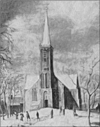 (Pentekening kerk) bewerkt detail van een 17e eeuws schilderij van