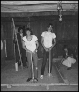 Het ‘nieuwe’ bestuur was meteen enthousiast. Adriaan ook. Hij was wat eenzaam en wilde graag volk om zich heen. Er werd afgesproken, dat de jongeren de ruimte met zelfwerkzaamheid zouden opknappen. Adriaan zou ze met raad en daad bijstaan. Hij stelde meestal tweedehands materialen beschikbaar. Het was voor hem prettig dat hij in de nieuwe ruimte ook eventuele museumbezoekers zou kunnen ontvangen. In de maanden die volgden, werd er hard gewerkt. Van niets moest het iets worden. Er is een plafond aangebracht plus een scheiding met de dars. Er moest een vloer gelegd worden en een bar getimmerd. De vloer bestaande uit antieke plavuizen (die Adriaan al in zijn bezit had) is gelegd door Henk en Willem Groenewoud. Zeer veel werk is verzet door Ben van Duin (timmerwerk) en Fred Groot (sanitair, verwarming, elektriciteit). Gelukkig hadden we ook metselaars, schilders en vele helpende handen in ons midden. Zoals gebr. Breed, gebr. Van Berkel, gebr. Swan, gebr. Schilder, Riet Mens, Dia en Carine Dam en de fam. Potter. Naarmate de tijd vorderde, groeide de ruimte onder hun handen en werd toen als vanzelfsprekend ‘De Hooiberg’ genoemd.