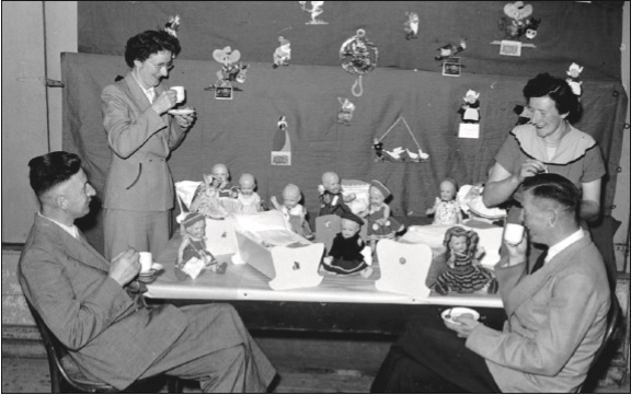 poppenkleren. V.l.n.r. To Breebaart-Pluister, Bep Schouten-Kaijer, Boukje Bakker,