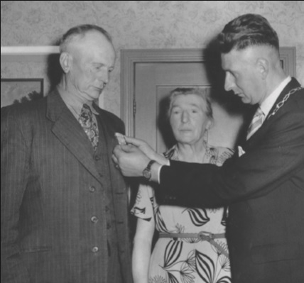 Klaas Braak, zijn vrouw en burgemeester Dirk Breebaart. Klaas Braak krijgt de koninklijke