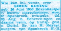 Koning, Simon, geboren op 26 juni 1906 en sinds 8 september 1944 vermist. In 1940 werd hij benoemd als gemeenteveldwachter in Spanbroek. Het gezin kwam te wonen achter in het gemeentehuis in Spanbroek. Later werd daar ook het distributiekantoor gevestigd.