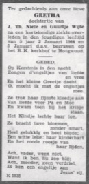 Tiny is heel lang bij een tante in de Langedijk geweest en later nog enige maanden bij schilder Rinkel in Opmeer. Martien werd ondergebracht bij de Fam J. van Diepen op de Raphaël-hoeve. Kleine Henkie was al tijdens de ziekte van zijn moeder naar Poepie Rood gebracht aan het Zuideinde. (Bij deze mensen was Guurtje Wijte voor haar huwelijk thuisgehaald.) Zijn grote zus Riet haalde hem dikwijls even om hem aan haar moeder te laten zien, maar wel van af een grote afstand natuurlijk.