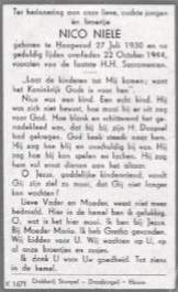 Op 22 oktober 1944 kwam Nico Niele op 14-jarige leeftijd te overlijden. Moeder Niele overleed op 25 december 1944, zij was nog maar 39 jaar oud. Haar man werd op die kerstdag 41 jaar en bleef alleen achter met acht kinderen. Het werd een vast onderdeel in het leven van de familie Niele om op de laatste zondag van de maand met het hele gezin naar het kerkhof te gaan en daar een bezoek te brengen aan het graf van moeder en de twee kinderen.