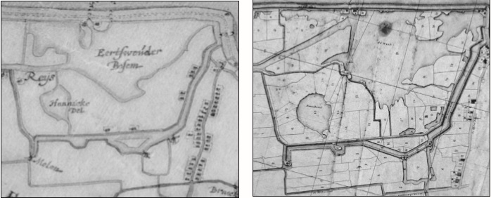 Links een detail van de kaart van Johannes Dou uit 1655.