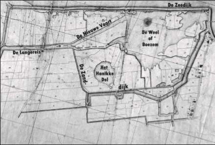 De Weel werd vroeger ook wel de Boezem genoemd. In 1399 wordt de ‘oude Bosem’ al vermeld wanneer hertog Albrecht van Beieren deze in pacht geeft om het te bevissen[2]. Dat de Weel sindsdien een belangrijk viswater is geweest wordt bewezen door een vermelding in het verpondingboek van Aartswoud uit 1783 waar men de Weel de Baarsboezem noemt[3]. Bovendien staat de Weel in 1832 bij het kadaster geregistreerd als viswater[4]. De Weel was toen reeds jaren in het bezit van de heren van Hoog- en Aartswoud. Om de omliggende landen van Aartswoud te beschermen tegen het water uit de Weel moest een kade worden aangelegd. Deze kade, die thans de zuidgrens van de Weelpolder vormt, werd de Sanderskade of Zanddijk genoemd. In 1460 word deze kade voor het eerst genoemd in een geschil tussen het Geestmerambacht en Aartswoud. Evenals de kaden van de Langereis is de Zanddijk vaak een bron van conflicten geweest, met name op het gebied van onderhoud. Het Geestmerambacht was verantwoordelijk voor alle waterstaatkundige werken die een onderdeel waren van de afwatering van de (Heerhugo-)waard[5]. Maar het waren de inwoners van Hoog- en Aartswoud die de dupe werden als het onderhoud van de binnendijken in gebreke bleef. Iets ten zuiden van Weel lag al in de 16e eeuw een ander klein watertje genaamd Hanke Del, ook wel Hanneke of Henneke Del.
