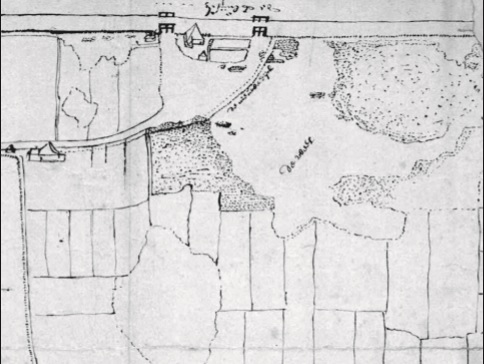 Duidelijk zichtbaar zijn de twee sluizen en de boerderij