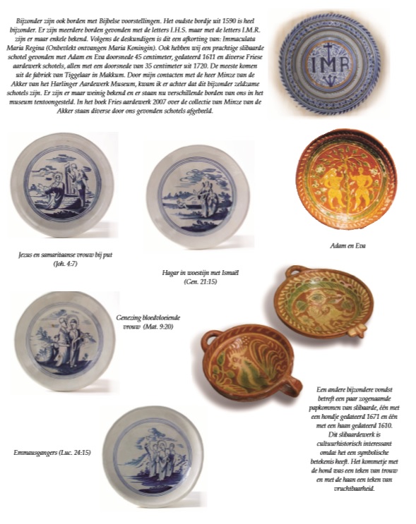 Het is eigenlijk begonnen in 1995. Toen kwam een kennis langs met een detector of hij op het erf mocht zoeken, want op het erf van een boerderij uit 1671 moest door de jaren heen wel wat oud spul zijn achtergebleven. Het eerste dat we vonden toen de detector aansloeg was een brok ijzer. Toen we wat dieper groeven, vonden we een bruine kookpan. De kennis was amateurarcheoloog. Hij zei: ‘Je moet hier verder graven.’ Zo is het eigenlijk begonnen. De kennis ging met wat muntjes naar huis en wij hadden er een prachtige hobby bij. De mooiste vondsten kwamen uit een oude sloot die op ongeveer 5 meter langs de boerderij liep. Door deze twee meter diep uit te graven vonden we majolica- en slibaarde borden en ander gebruiksaardewerk. Verspreid op het erf vonden we ook zogenaamde askuilen. Er werd op het erf een kuil gegraven, waar het afval werd ingegooid. We vonden niet alleen gebruiksaardewerk maar ook botten van beesten. We haalden zo 400 jaar geschiedenis naar boven, het gaf een beeld van hoe ze geleefd hadden op de boerderij. Door een kennis werd ik er op gewezen dat er toch wel bijzonder aardewerk gevonden werd. Delfts blauw en tegeltjes, dat was me wel bekend, maar oud Majolica en Slibaarde was voor ons nieuw. Ik vergrootte mijn kennis door allerlei lectuur over aardewerk te kopen, onder andere op een rommelmarkt. Daar kocht ik een boekje over Nederlandse Majolica van Dingemans Korf, dat is voor ons een leidraad geweest om veel vondsten te restaureren. Ook bij een bezoek aan het openluchtmuseum in Arnhem kocht ik een boek over dit onderwerp. Van verschillende vondsten op het erf, die ik niet thuis kon brengen, vond ik gegevens terug in dat boek. Hieronder een aanvulling op de vondsten gepubliceerd in onze uitgave van 2001.