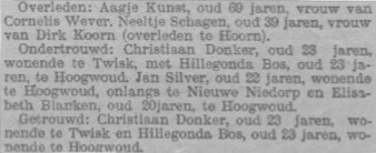 Jn de Vries [uit] Hoogwoud zondag 3 dec: overl: oud 60 jaar. 11 Dec: het heerenhuis van den familie Pijper te Hoogwoud bij O. Schermer verk[ocht]: voor ƒ 6.010 kooper Jn Bakker van Hoogwoud. Dond: 20 dec: overl: den vrouw van W.F. Gorter te Schagen, Barbera Johanna Groen oud 36 jaar, ten gevolge met eene operatie. Den plaats van den familie Smit te Barsingerhorn publiek verk: gr[oot]: 19-38-19 h.a. gemijnd op ƒ 2800 door C. Smit van Heiloo, en komt op ƒ 68.700 zoo. 25 Dec: overl: Kl. Hartland vrouw van Jb Wouterse te Hoogwoud oud 85 jaar. 24 Dec: Sm Kort van [de] Gouw overl: oud 83 jaar. 29 Dec: den vrouw van D. Rooker Hoogwoud A[t]je Zee overl: oud 56 jaar. 31 Dec: den geheelen dag natte sneeuwjagt met groote vlokken: [we] konden niet jagen.