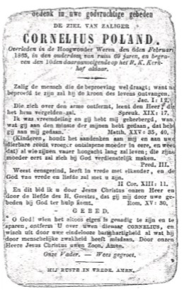 Helaas, in maart 1886, overleed Cornelis Buisman en werd Trijntje Poland een derde maal weduwe. Ze was inmiddels 61 jaar, maar nog wel zeer levenslustig. Wederom kwam de notaris om de boedel te scheiden en in de akte werd beschreven dat Trijntje kon blijven wonen in haar huis in Westerblokker. Daar maakte zij kennis met Dirk Krom, die als één van de pioniers zijn stek had gevonden in de Haarlemmermeer. Van oorsprong kwam hij echter uit Blokker, hij was onlangs voor de tweede keer weduwnaar geworden. Na hun huwelijk in oktober 1888 verhuisde Trijntje naar Dirk in de Haarlemmermeer, waar hoeve Zeldenrust zijn eigendom was.