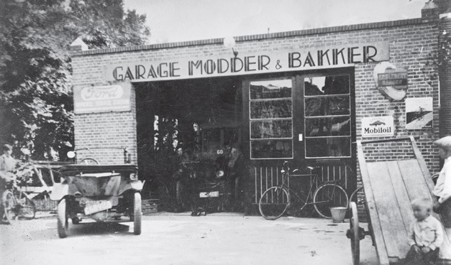 Het was 1930 toen Arie Modder en Betje het pand van fietsenmaker Simon Koorn (nu Burgemeester Hoogenboomlaan 51, thans Kapsalon de Boekel) overnamen. Ze hadden nu een woonhuis, een winkel en een werkplaats en die kon je toch niet onbenut laten. Dus er kwam weer een fietsenwinkel in en ook de werkplaats bleef bestaan. Ook was er een benzinepomp net voor hun huis. Ondertussen was Arie dus al gaan samenwerken met Cor Bakker. Ze hadden een paar interesses gemeen en dat waren techniek en alles wat door die techniek kon voortbewegen. Motoren vonden ze prachtig en ze begonnen in een klein schuurtje van vader Jan Modder daarmee te werken. In 1930 werd er aan het zogenaamde herenhuis van oud-burgemeester Pijper een garage gebouwd. En op de gevel staat dan GARAGE MODDER & BAKKER. Ze hadden al gauw een aardig lopend bedrijf. Er was achter de garage een plaats gemaakt voor de bottelarij. Dus alles toen in één pand. Eind jaren ’30, het moet bijna 1940 geweest zijn, gingen Arie en Cor met hun werkzaamheden uit elkaar. Cor Bakker ging verder met de garage en Arie Modder nam de bottelarij mee tot aan de verkoop daarvan in 1948. Toch bleef Arie Modder nog trouw de garage bezoeken, deed nog verschillende klusjes en reed vaak taxi voor het bedrijf.