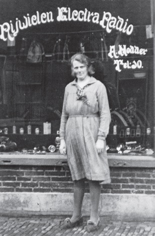 Mevrouw Betje Modder-Ivangh voor de winkel.