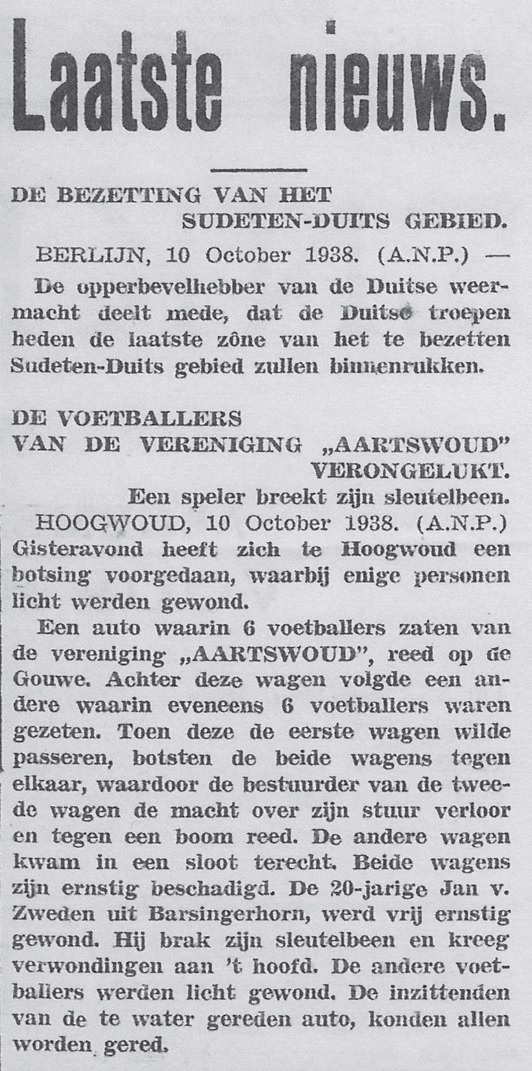 Weet je al dat we Donderdag bericht hebben gekregen dat Piet Februari militaire dienst moet? (Middelburg). Dat Moeder je schreef, dacht ik, ik zal hem Maandag wel even overbrieven wat Daan Pool en z’n menschen hadden te smoezen. Maar dat schuif ik nu maar op de achtergrond, want het was Zondag voor ons een groote pechdag. De voetballers moesten naar Hoorn, en aangezien het koud weer was , hadden ze er niet veel puf op. De wedstrijd was niet afgelast; thuisblijven zou dus een tientje boete worden en ze zitten met een leege kas. Ze hebben toen besloten met een paar auto’s te gaan, onze en die van de smid. Ze waren met z’n twaalf’n in elke wagen 6. ’s Avonds 5 uur kwamen ze terug langs de Gouw. Vanaf Hoorn had Piet voor gereden en de Christax daar achter. Toen ze bijna thuis waren, even voorbij P. Helder wilde Chris, Piet passeeren. Piet rekende hier in ’t geheel niet op, en ook de andere jongens niet, die in onze wagen zaten. Hij reed dus z’n gewoone gangetje door (50km) rechts van de weg. Toen ineens de jongens riepen “Kijk Chris nou us; die komt naast ons”. En vóór dat Piet zijn vaart had kunnen temperen kwam hij n aar rechts en sneed Piet de weg af terwijl ie met het achterste van z’n wagen het voorste van de onze aanramde. Hierna haalde hij z’n stuur zóó om, dat hij de boomen waar ons chevroletje mee stond te zoenen net vrij liep en met een paar koprollen in de sloot voor het huis van Hamming terecht kwam; onderste boven de vier wielen waren alleen nog te zien. De chevrolet van ons kreeg een verschrikkelijke oplawaai totaal aan puin is ie, onherkenbaar. En allen verwonderden er zich over dat de zes inzittenden nog leefden. Hamming dadelijk aanwezig en heeft de andere 6 jongens die in de Christax op elkaar lagen er uit gehaald. Die waren vrijwel ongedeerd, alleen van streek. Uit onze , waren ze allen licht gewond de een wat erger dan de ander. Piet van Zweden zat voor naast je broeder, die is er het ergst aan toe. Hij brak zin sleutelbeen en is aan z’n hoofd gewond. Verder zaten er achter in Gerd v Dijk, D. Landman, Cor v Sch. en Rommerd denk ik. Zie Zoo dat is het. Ik kan je natuurlijk alles niet schrijven, dat duurt me te lang. Maar als je gauw weer eens thuis komt kakelen we er een paar uurtjes over. We waren blij dat ze allen nog leefden, anders zou ’t onvergetelijk geweest zijn. Herman had er nu ook geen strop aan de zaal was staand vol, er kon geen muis meer bij. Hetgeen er vertoond werd was O.K. Zal je er niet van droomen Wimpie. Welterusten hoor! Veel hartelijke groeten van ons allen en groet ook Jaap en Joop.