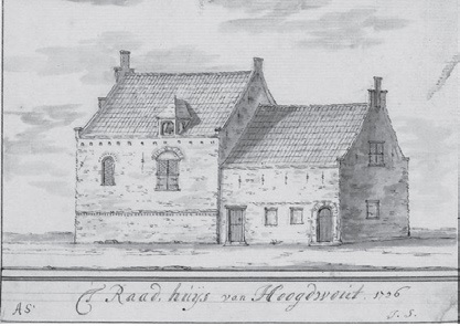 De bovenste tekening van het raadhuis van Hoogwoud is gemaakt