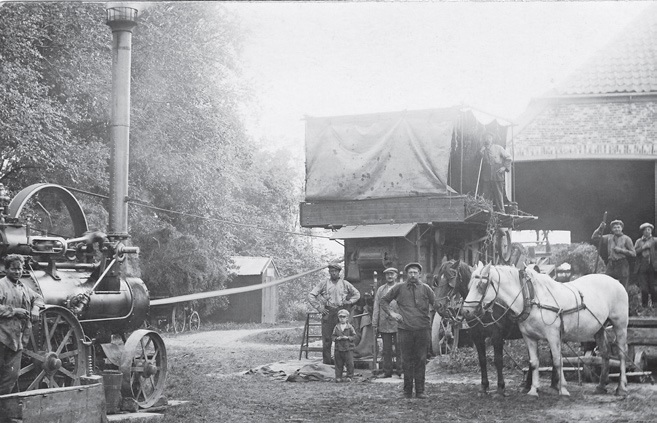 Alleen het dorschen geschiede met een z.g. Hekelmachine gedreven door een locomobiel. Het zaad moest dan later nog schoongemaakt worden met waaiers door handkracht. Het stroo werd los op schelven gezet en in hoofdzaak op de plaats zelve gebruikt voor mest, daar kunstmest toen nog niet bekend was. Werden er soms eenige wagens verkocht dan moest dit losse stroo eerst in bossen worden gebonden.