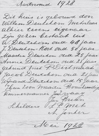 Briefje bij de bouw in het pand verstopt, bij de verbouwing teruggevonden.