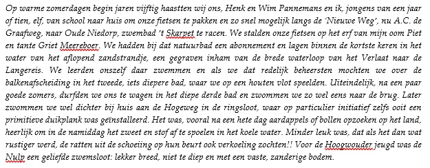 Ik mocht onlangs weer getuige zijn van hoe nu, na ruim vijftig jaar, mijn kleindochter Hanna, ondanks het koude voorjaar, met liefde en enthousiasme door de badjuffen van nu, vertrouwd werd gemaakt met het natte element. We mogen ons gelukkig prijzen met de vooruitziende blik van Dirk Breebaart en de inzet van de mensen van het eerste uur, aan wie we het toch maar te danken hebben dat nu al weer een aantal nieuwe generaties in de zomermaanden veilig en dicht bij huis heeft leren zwemmen en heeft kunnen genieten van deze pure vorm van waterrecreatie. Dat er nog veel zullen volgen!