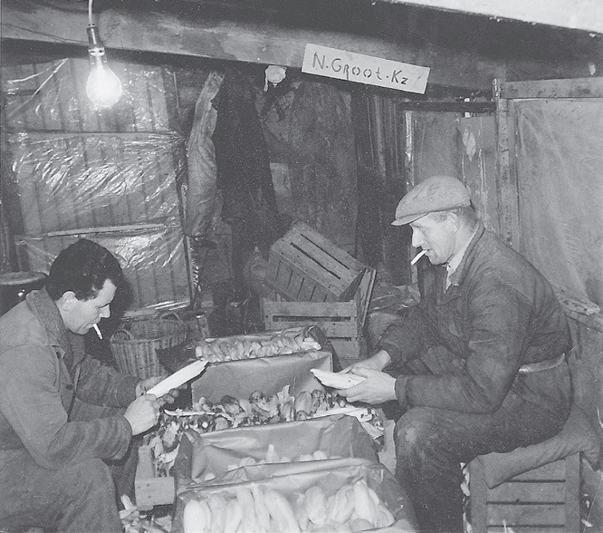 Gert Ursem met Klaas Groot in de witlofschuur.